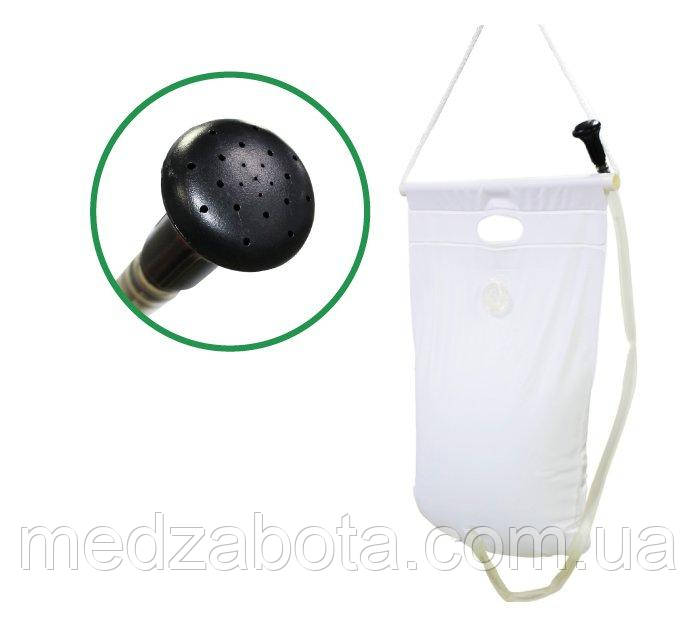 Зручний мобільний душ зі щільного ПВХ білого кольору для комфортного проведення гігієнічних процедур людям, які дотримуються постільного режиму. Контейнер заповнюється теплою водою та щільно закривається кришкою. Найкраще використовувати в комплекті з надувною ванночкою